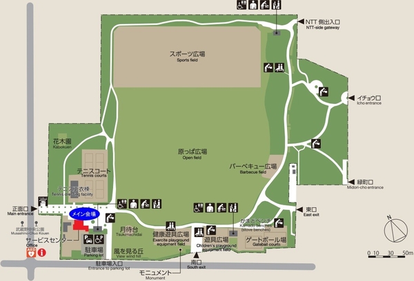 武蔵野中央公園は、東の井の頭恩賜公園、西の小金井公園にはさまれ、両公園のほぼ中央に位置しています。