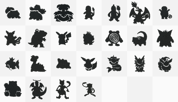 シルエット刺繍は、シャツの左胸、右裾、そして左袖口のいずれかにポケモンのシルエット刺繍が施せる新しいサービスです。『ポケットモンスター 赤・緑』に登場する25種のポケモンからお選びいただけます。