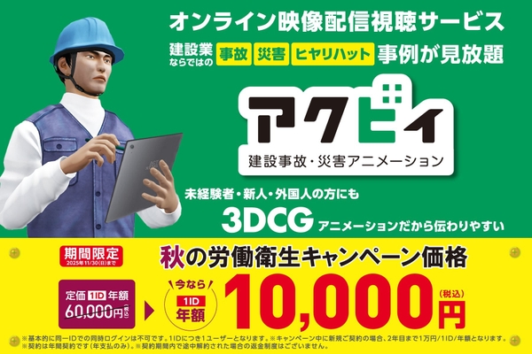 建設事故・災害アニメーション配信サービス「アクビィ」を提供する株式会社アクトエンジニアリング(本社:東京都港区、代表取締役社長:武藤眞敬)は、「全国労働衛生週間準備月間」開始日である2025年9月1日(月)より、本サービスの年間契約プランが特別価格となる期間限定キャンペーンを開始いたします。