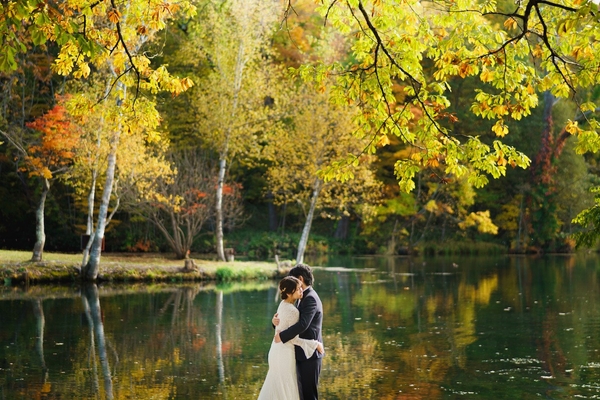 北海道の紅葉は都心に比べて少し早め。10月には美しい紅葉を背景にした撮影が可能です。この時期にしか見られない幻想的な景色の中で、特別な一枚を残しませんか?