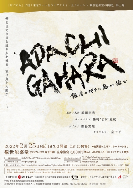 文化庁/公益社団法人日本芸能実演家団体協議会/東京アート&ライブシティ構想実行委員会主催公演、『「ADACHIGAHARA」-銀座の地下に鬼が棲む』が2022年2月25日 (金)に観世能楽堂(GINZA SIX 地下3階)(東京都中央区銀座6-10-1GINZA SIX 地下3階)にて上演されます。チケットはカンフェティ(運営:ロングランプランニング株式会社、東京都新宿区、代表取締役:榑松 大剛)にて発売中です。