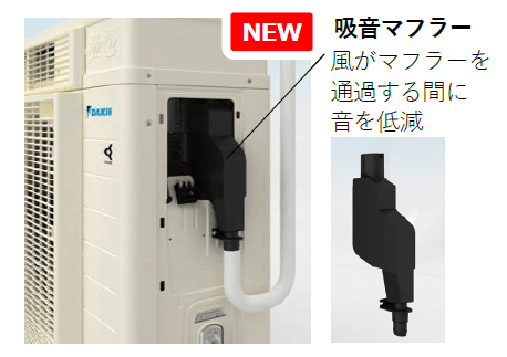 「加湿・換気ファン」の回転数を上げると風切り音が増大しますが、「加湿ホース」の通風経路に「吸音マフラー」を搭載することで、室内で聞こえる音を抑えました。加湿量と換気量は増加しますが、人が感じる運転音は従来通りを維持しました。