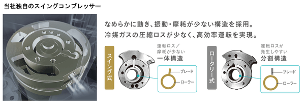 本商品は、独自の要素部品と機能で節電をサポートします。エアコンの消費電力の多くを占める圧縮機には、独自形状と滑らかな動きでエネルギーロスを抑えるスイング式を以前から採用し、高効率な運転を可能にしています。気流制御においては、暖房時は冷えやすい足元を中心に暖め、冷房時は気流を循環させてお部屋をすばやく※4快適にし、室内の温度ムラを抑えます。温度ムラの抑制は設定温度の上げすぎ、下げすぎの防止にもつながります。