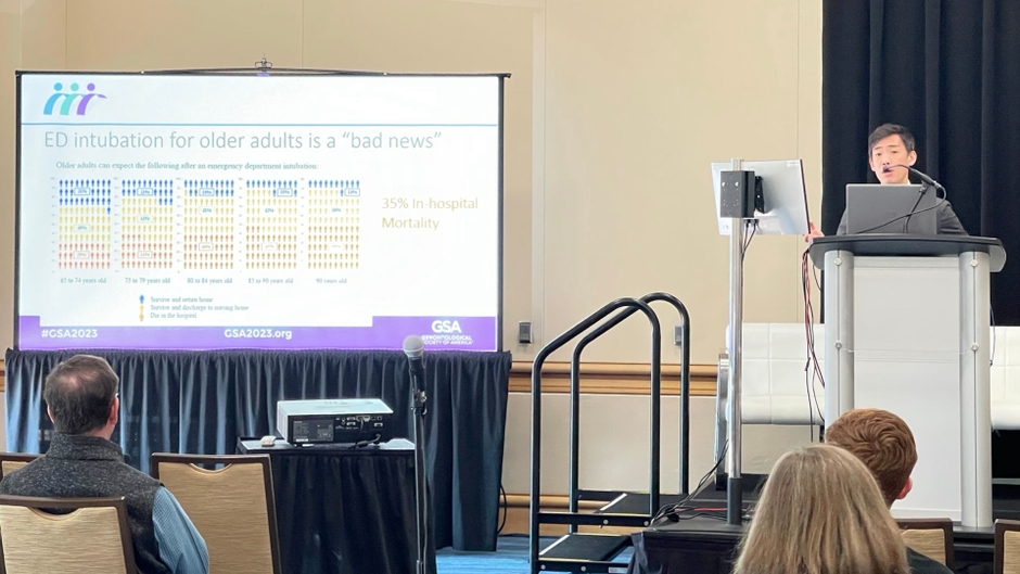 アメリカ老年医学会「GSA2023」で開催したVRセミナーでは、共同開発パートナーのハーバード大学医学部准教授・大内啓医師が登壇し、開発したVRを活用して緩和ケアの基本的な技術となるアセスメント能力をトレーニングする講義を行いました。