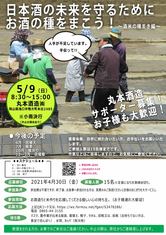 岡山県でドメーヌ蔵として酒造りをしている丸本酒造株式会社(本社:岡山県浅口市鴨方町本庄2485、代表取締役:丸本 仁一郎、以下 丸本酒造)は、年々消費量が減っている日本酒業界を守る為、より日本酒の良さを体感してもらう為に酒米の種まきイベント開催致します。自社栽培を行う酒蔵ならではのイベントです。