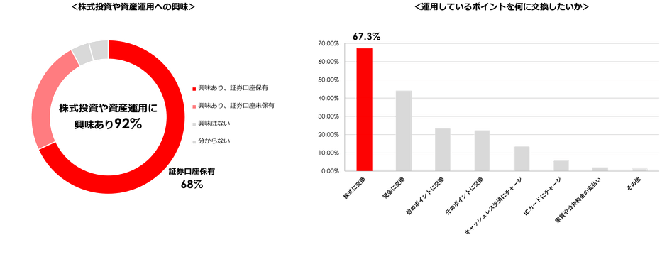 当社が行ったStocKPoint会員アンケートによると、回答してくれた1万人超の会員の内、92%が「株式投資や資産運用に興味あり」と回答しており、その内の68%が「証券口座を保有していると」と回答。また、67%が運用したポイントを「株式に交換したい」と回答しています。
