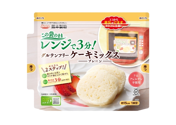 今回使用している「グルテンフリーケーキミックス」は、袋の中にキャノーラ油と豆乳を入れて混ぜ、レンジで加熱したらケーキが簡単に作れる便利な商品です。