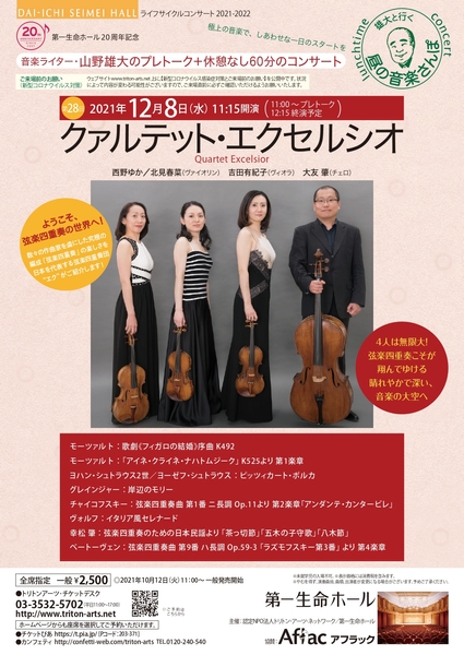認定NPO法⼈トリトン・アーツ・ネットワーク(東京都中央区、理事⻑:⻑浜⼒雄)主催による、第一生命ホール20周年記念〈ライフサイクルコンサート〉『雄大と行く 昼の音楽さんぽ「第28回 クァルテット・エクセルシオ(弦楽四重奏)」』が2021年12月8日 (水)に第⼀⽣命ホール(東京都中央区)にて上演されます。チケットはカンフェティ(運営:ロングランプランニング株式会社、東京都新宿区、代表取締役:榑松 ⼤剛)、主催者チケットデスクほかにて10⽉12⽇(⽕)より発売開始いたしました。