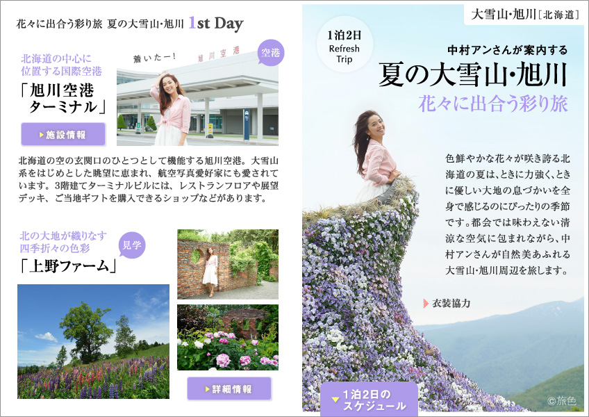 1泊2日の旅をナビゲートするのは、ファッション誌やテレビ番組などで活躍するモデルでタレントの中村アンさん。いまなお原始の姿を残す大雪山に抱かれた、3つの庭で開かれるガーデンショーを中心に、大雪山、旭川周辺の魅力を紹介します。
