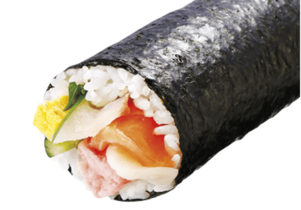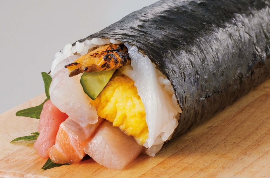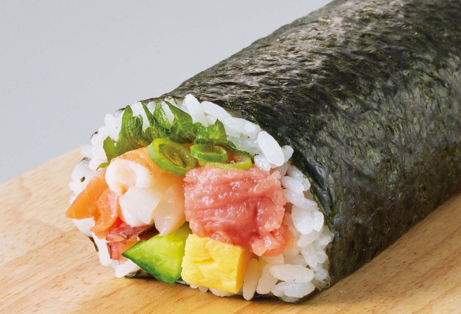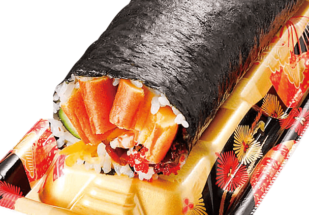機能性表示食品であるライフオリジナルの“伊勢黒潮まだい”や生サーモンなどをふんだんに使用した贅沢な海鮮太巻。