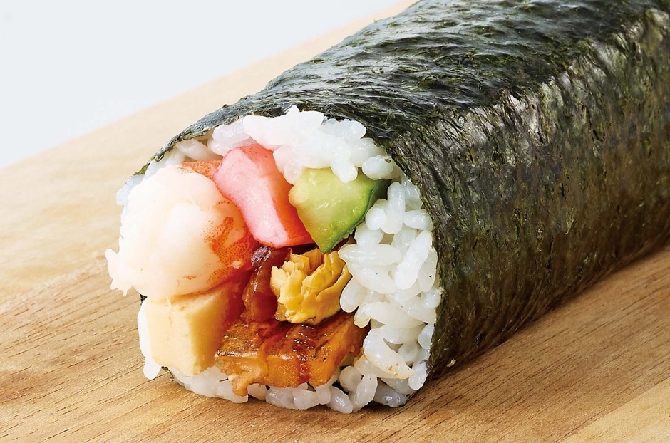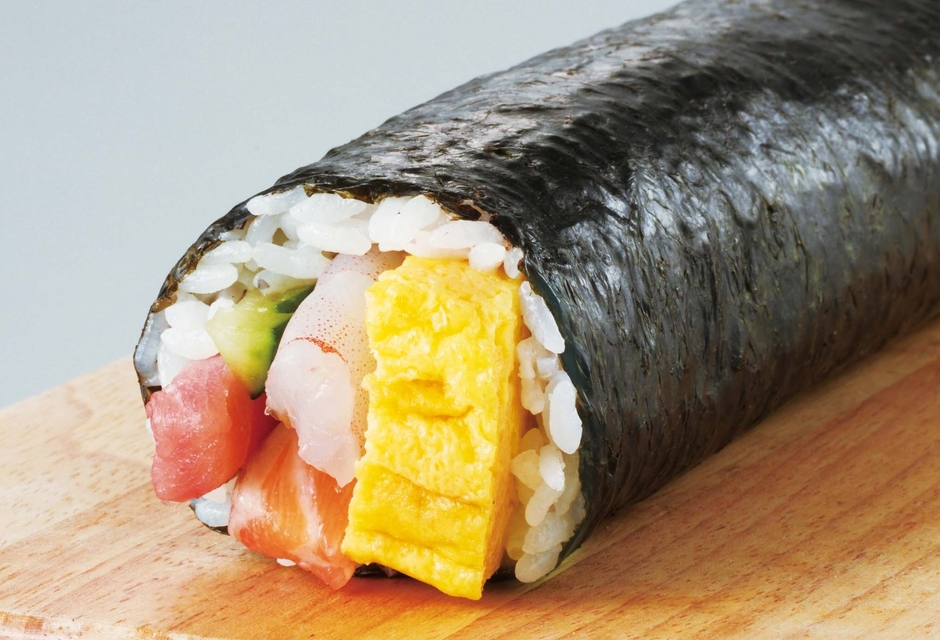 凍結していない魚のすり身が入った甘めの厚焼き玉子をふんだんに使用し、『七福』にちなみ『7種』の具材で巻きました。