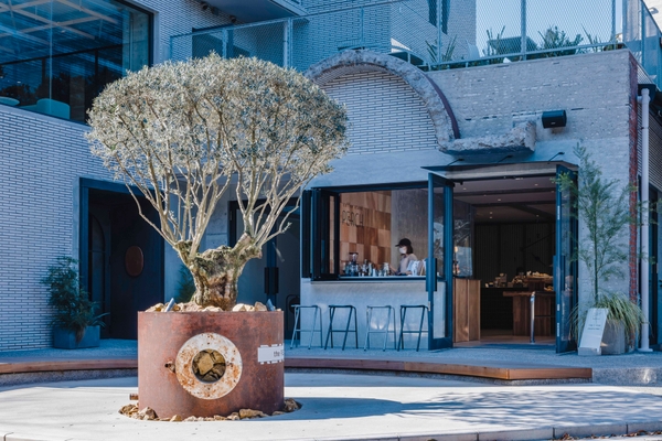 各階には既存のフロアマップに半透明のアクリルで上書きしたようなマップサインを、建物の正面には元々屋上にあったボイラータンクにロゴとフロアマップを施しシンボルとして配置し樹齢300年のオリーブを植栽