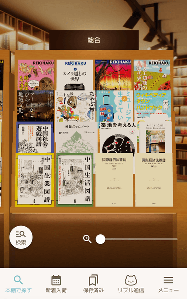 雑誌コーナー専用の棚を用意し、画面の小さなスマホでも見やすいように表紙を向けた並べ方のみ取り入れています。