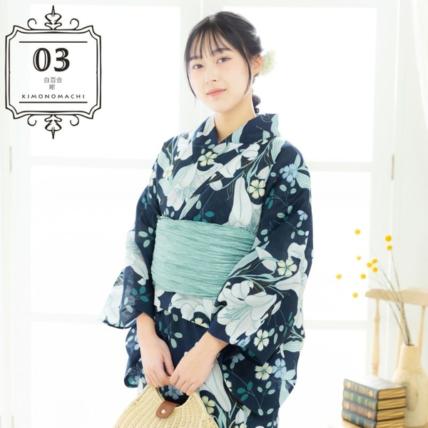 浴衣:深い紺色の地。浅い青緑の線で描かれた大きな百合の花に萩の葉、撫子の模様。白に淡い赤みのグレーのぼかしの百合の花。黒の影がアクセントになった淡い白緑色の葉。緑と薄緑の萩、淡い黄色やブルーグレーの撫子の小花が、落ち着いた中に可愛らしさを添えます。