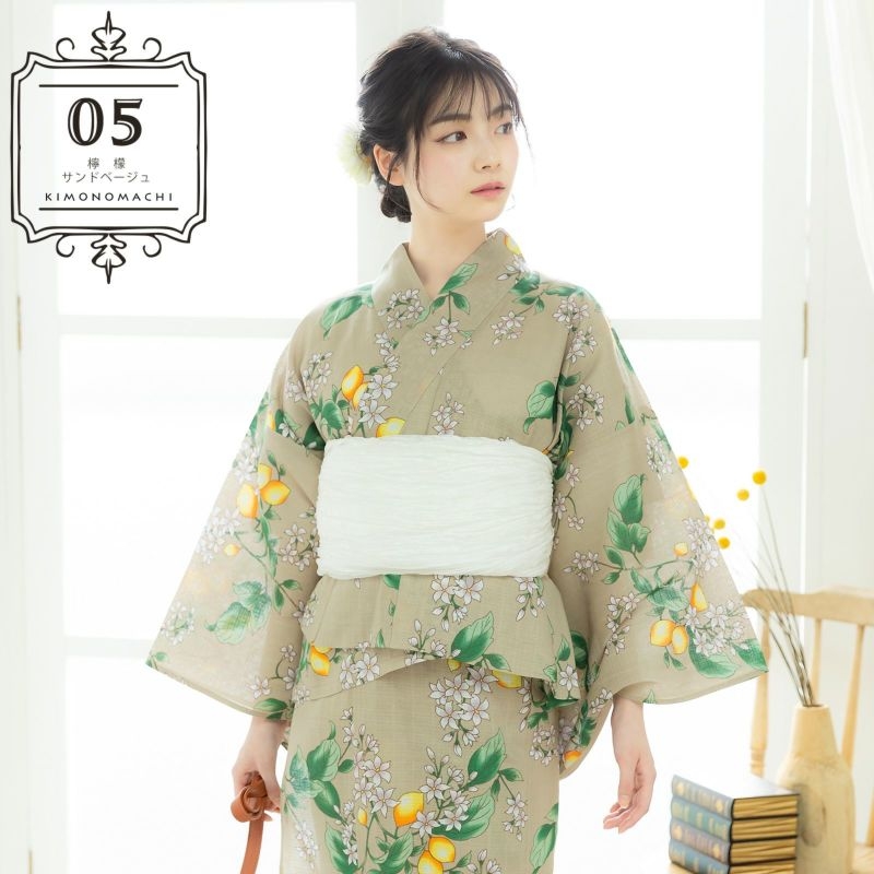 浴衣:グレイッシュな鈍いベージュの地に、花や実をつけたレモンの柄。ハッキリとした深い緑と白緑色のぼかしの葉。白と淡いグレイッシュなピンクの花。あざやかな橙色、黄色、白のつややかな実。いきいきとしたレモンのデザインが、爽やかさと明るさを感じさせるデザインです。
