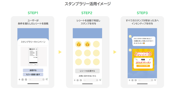 本機能は、LINE上にスタンプカードを構築し、レシート投稿、QR読み取り、ID入力の3種よりスタンプ付与条件を選択できるもので、ショッピングモールやイベント会場での買い回り施策、複数回の購入が想定される商品・ブランドでの継続施策として効果的です。