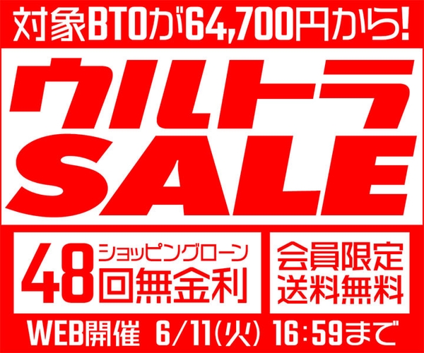 パソコン工房・グッドウィルを運営する株式会社ユニットコム(代表取締役:端田 泰三、本社:大阪市浪速区)は、パソコン工房WEBサイトにて、『ウルトラセール』を2024年6月11日(火)16時59分までの期間限定で開催中です。
