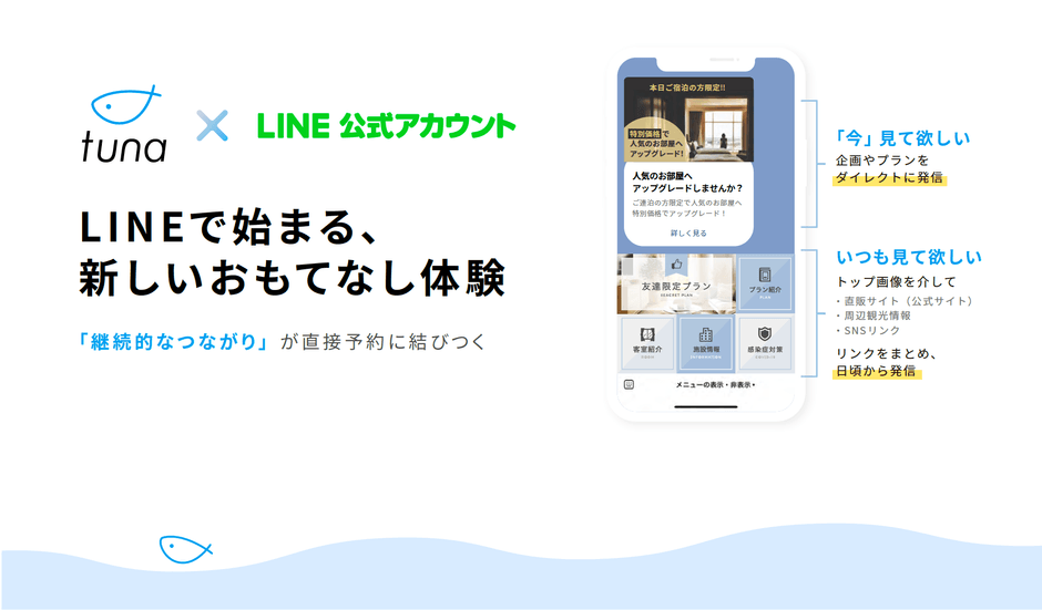 tunaを導入することで、宿泊施設はLINE上でアプリと同じような機能を提供することができます。これまで、アプリ導入は開発・運用コストが高く、仮に導入しゲストにダウンロードいただけても、「忘却され、画面から埋没し、削除」が現実で、双方に大きな利点がありませんでした。私たちはこれらの課題解決にはLINEの活用が最適であると考えました。