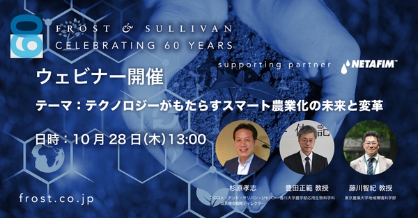 この度、米国に本社を置くビジネスコンサルティング企業フロスト・アンド・サリバン ジャパン株式会社(所在地:東京都港区、代表取締役:ロビン・ジョフィ)(以下、フロスト・アンド・サリバン)は創立60周年を記念したキャンペーンの一環として、「サステナビリティ」をテーマに10月28日(木)13:00(日本時間)よりイスラエル発アグリテック企業ネタフィムとの共同ウェビナー「テクノロジーがもたらすスマート農業化の未来と変革」を実施いたします。