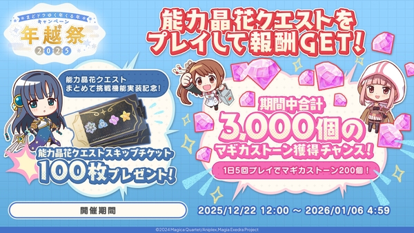 2025年12月21日(日)18時30分に、能力晶花クエストのまとめて挑戦機能の実装を記念し、ユーザーの皆様に能力晶花クエストスキップチケットを100枚をプレゼントいたしました。さらに、能力晶花クエストのまとめて挑戦機能の実装を記念し、ミッションをプレイすると期間中合計でマギカストーン3,000個などを獲得できるミッションを開催いたします。