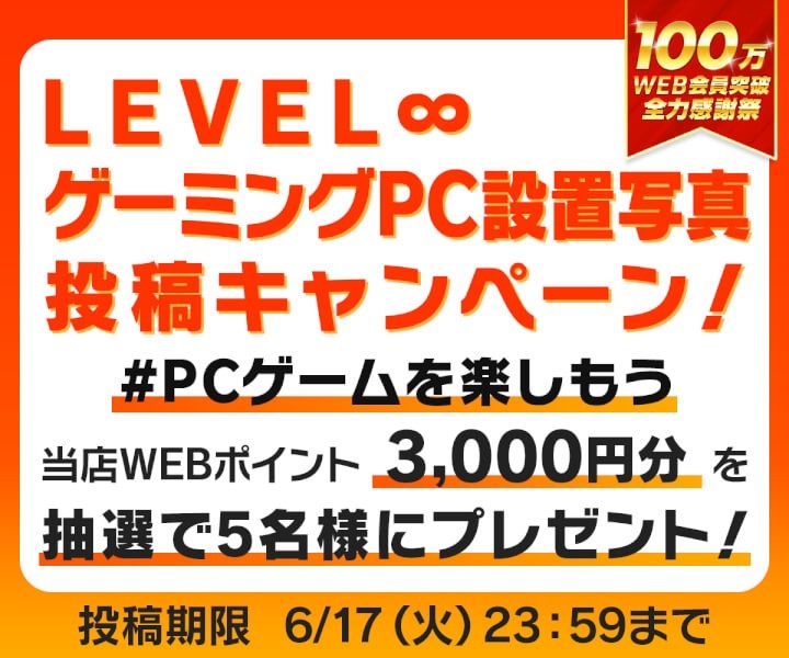 キャンペーン期間中、LEVEL∞ゲーミングPCの設置写真に指定のハッシュタグを付けてX(旧Twitter)で投稿いただくと、抽選で5名様にパソコン工房WEB通販サイトで使える3,000円分のWEBポイントをプレゼント!