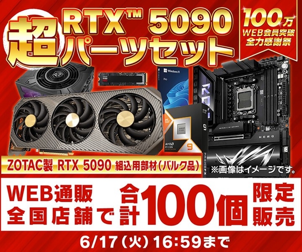 WEB会員登録者数100万人突破を記念して、「RTX 5090超パーツセット」を販売!WEB通販・各店舗にて、GeForce RTX 5090 組込用部材(バルク品)を含む自作PCパーツのセットを合計100個限定で販売いたします!