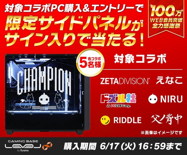 指定のLEVEL∞コラボゲーミングPCをご購入いただいた方を対象に、抽選で各コラボ5名様に限定サイドパネルがサイン入りで当たるキャンペーンを期間限定で実施!過去に対象のコラボゲーミングPCをご購入いただいた方も抽選に応募可能です。