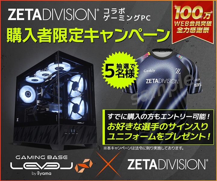 期間中にZETA DIVISION LEVEL∞ コラボゲーミングPCをお買い上げ、ならびにエントリーいただいた方の中から、抽選で5名様に、お好きなメンバーのサイン入りユニフォームをプレゼント!過去にZETA DIVISION LEVEL∞ コラボゲーミングPCをご購入いただいている方も対象となります。