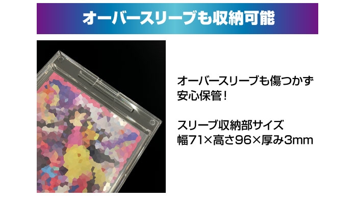 収納可能サイズが幅71×高さ96×厚み3mmのため、厚みのあるカードやオーバースリーブ、多重スリーブも収納可能です。
