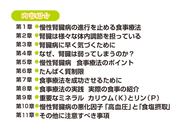 全ての腎臓病の方の参考になればと思い、本書を執筆いたしました。腎臓病について、また食事療法について正しく理解していただき、特に食事療法が必要な方々が実践、継続しやすくなれば、と願っております」