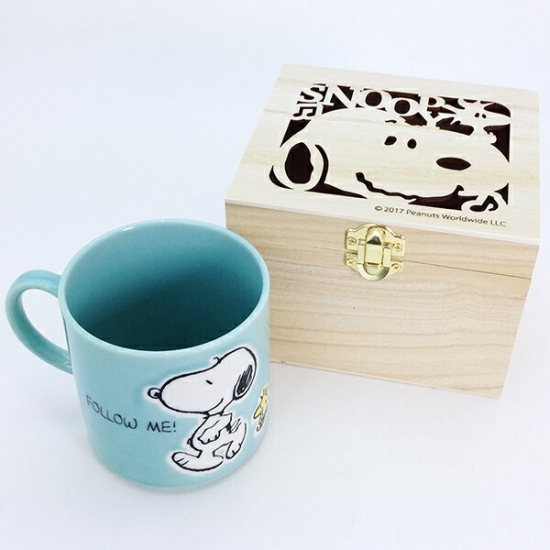 お次は、木箱入りのマグカップです。高級感ありますね~。マグカップにはウッドストックとお散歩中のスヌーピー。ブルーグリーンの絶妙なカラーもオシャレですよね。