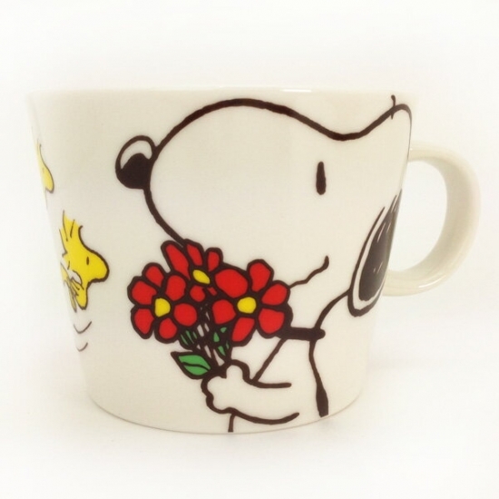 THANKSスヌーピーのマグカップです。かわいいお花を持ったスヌーピー。誰にお花をあげるつもりなのでしょうね。いつもの感謝の気持ちを伝えるのに、ピッタリなデザインだと思いませんか?貰った人も、思わずニッコリしてくれそうです。