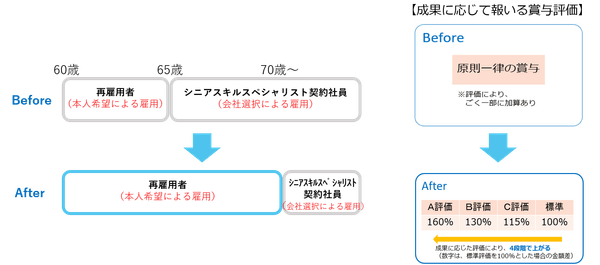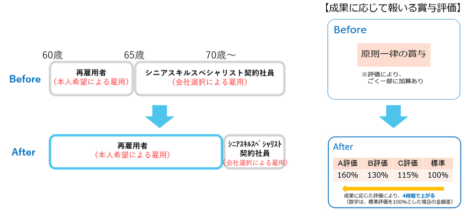 さらに、従来の報酬設計を見直します。賃金・賞与への配分を厚くするとともに、賞与には4段階の上げ幅を設け、成果に応じてきめ細かく報いる新たな評価体系とします。ベテラン層のさらなる活躍を推進し、事業の成長拡大に必要な人材力の強化につなげます。