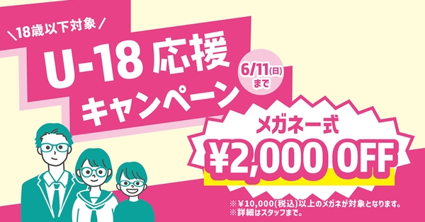■『U-18応援キャンペーン』18歳以下の方限定!メガネ一式お買い上げ金額から税込2,000円OFF!