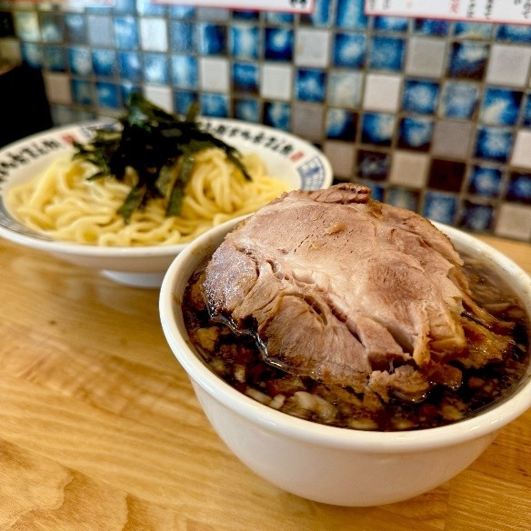麺は、手打ちうどん用の小麦粉と中華麺用の小麦粉をブレンドした特製麺を使用。コシがあり、ツルツルとモチモチ感が強く、しっかりとした食べ応えのある麺が、コクのあるつけ汁とよく合います(大盛り無料!)。