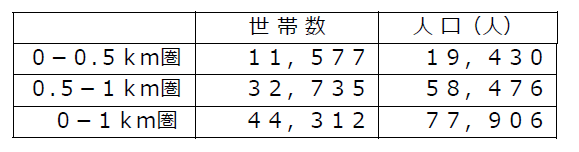 ・店舗から1km圏内は単身世帯比率が58.0%、2人世帯比率は21.0%と全体の8割が少人数世帯です。