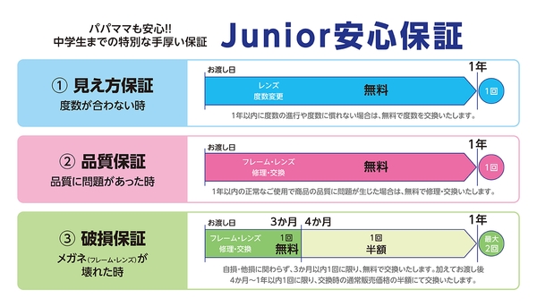 メガネを安心して長くご利用いただくために、パリミキでは充実したサポートプランをご用意しております。Junior安心保証は中学生以下のお子さまを対象に、1年間の見え方保証やフレーム・レンズの破損保証を完備。また、ご購入後3ヶ月は壊れてしまっても無料で交換可能。取り扱いに慣れていないお子さまも安心してご使用いただけます。