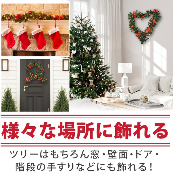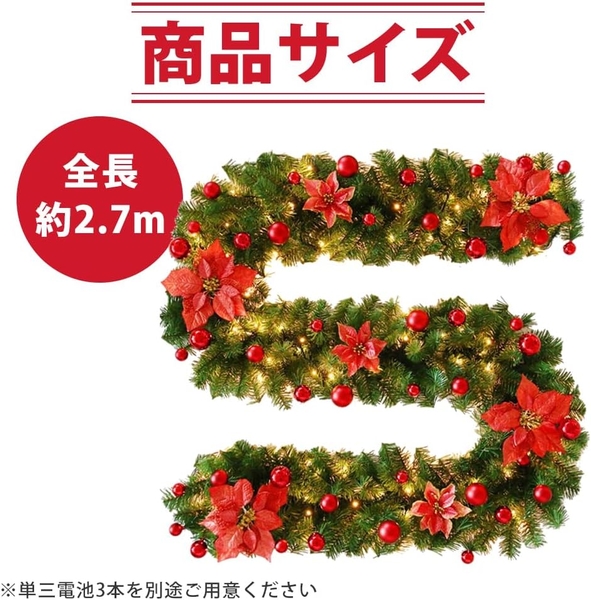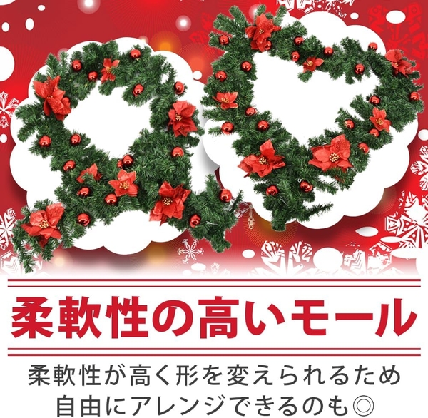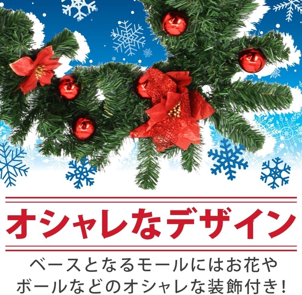 クリスマスの雰囲気をより一層引き立てるガーランドは、赤を基調としたボールや花があしらわれています。予め装飾がモールにくっ付いているため、自分で貼り付ける作業は一切不要。お手元に届き次第すぐにデコレーションに取り掛かれます。窓・ドア・壁・階段の手すりなどアイディア次第で様々な場所の飾り付けにお役立ていただけます。