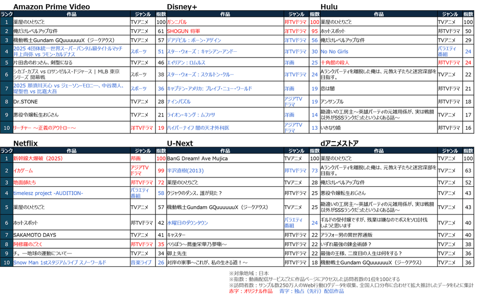 ・Disney+:「ガンニバル」、「SHOGUN 将軍」といった同社のオリジナル作品や、ウォルト・ディズニー社傘下のTVドラマや映画作品がランクイン。マーベルやスターウォーズといったコアファンが多い作品が上位を占める。