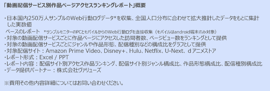 また、興味を持たれた作品についてユーザーが訪問した作品ページの動向により、オリジナル、独占配信、スポーツのライブ配信など動画配信サービスごとの特徴が表れたといえる。