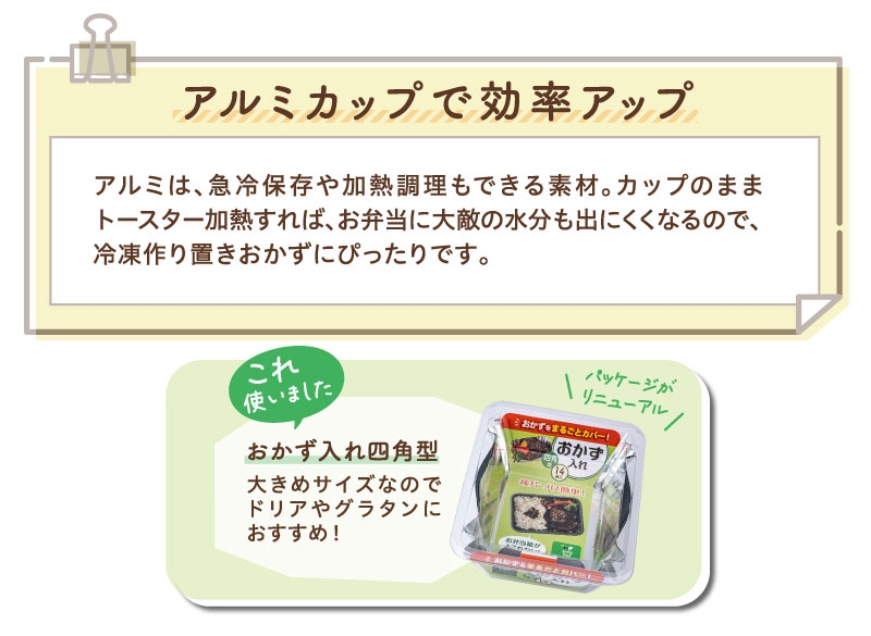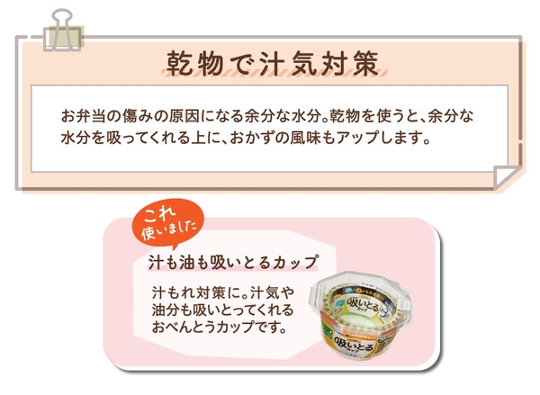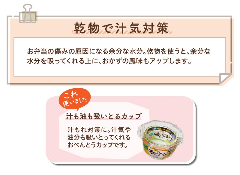 おかずの水分が多いと時間が経つにつれ細菌が増えやすいので、お弁当に入れる前に汁気対策が大切! また、冷凍したものを解凍するタイミングでも水分が出やすいので、レシピに工夫も必要です。 さらに、汁気を吸いとる機能のあるお弁当カップの活用もおすすめです!