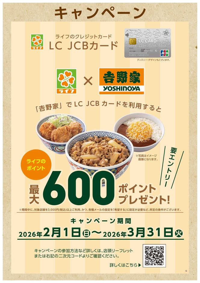 ライフのクレジットカード「LC JCBカード」を運営する株式会社ライフフィナンシャルサービスは、2月1日(日)から3月31日(火)までの間、株式会社吉野家の対象店舗にて「LC JCBカード」を合計で税込3,000円以上ご利用いただくと、税込200円ごとに1ポイントを進呈する通常の引き落としポイントに加えて、ライフのポイントを最大600ポイント進呈する特別なキャンペーンを実施いたします。