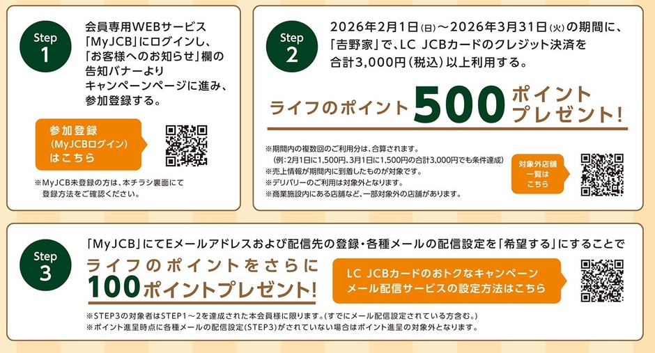 「My JCB」でエントリーいただくなど、所定の条件を満たした上、「吉野家」の対象店舗で「LC JCBカード」で合計3,000円以上(税込)ご利用いただくと、ライフのポイントを最大600ポイント進呈いたします