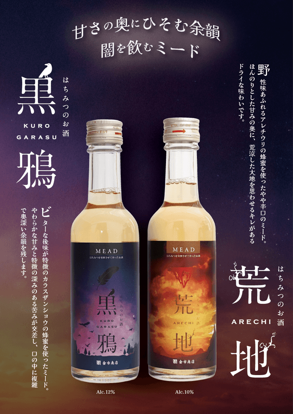 株式会社金市商店(本社:京都市中京区、代表取締役:市川拓三郎)は、2025年9月から3か月連続で異なる蜂蜜を使用する新作の蜂蜜酒(ミード)を発売。第一弾の自社醸造所である「京都蜂蜜酒醸造所」で仕込んだ『The MEAD くり』(9月9日発売)に続く第二弾は、自社が運営する「蜂蜜専門店ミールミィ」で長年展開している「はちみつのお酒シリーズ」からのハロウィンシーズンにぴったりな新作「はちみつのお酒 荒地(アレチ)」「はちみつのお酒 黒鴉(クロガラス)」の2種類を10月10日(金)に新発売。