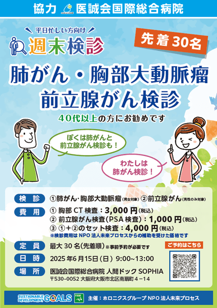 医療法人医誠会 医誠会国際総合病院(大阪府大阪市南扇町 代表者:谷 幸治)は、NPO法人未来プロセスの医療啓発活動として毎月開催されている「週末検診」イベントに協賛しています。6月15日(日) 9:00~13:00 「肺がん・胸部大動脈瘤・前立腺がん検診」を実施します。先着30名で事前予約をすでに開始しています。本イベントは、週末の時間を利用できることに加え、NPO法人からの補助を活用した費用設定で、より多くの方に受診していただきやすくなっています。医療技術の進歩とともに、完治につながる病気の早期発見がカギとなっています。 がんや生活習慣病の早期発見・治療への第一歩である「検診」の重要性を広く周知し、検査・受診につながる啓発活動を推進しています。一人でも多くの方に活用いただけるように通年スケジュールでの週末検診イベントを開催予定です。