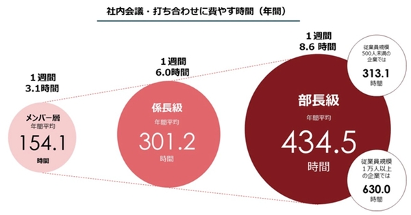 さまざまな場面で行われる「会議」ひとつとっても、たくさんの無駄が潜んでいます。ある調査によると、日本企業において、階級が上がれば上がるほど、また企業規模が大きくなればなるほど、社内会議での拘束時間は長くなる傾向にあることがわかっています。もしもその会議が、何かを決定したり、アクションを明確にして次の行動へスムーズにつなげたりできるものになっていなければ、マネジメント層の時間は大幅に浪費されることになってしまいます。