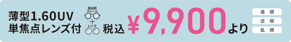 うす型1.60UV単焦点レンズが付いて、メガネ一組 税込¥9,900より、その他豊富にご用意しております。
