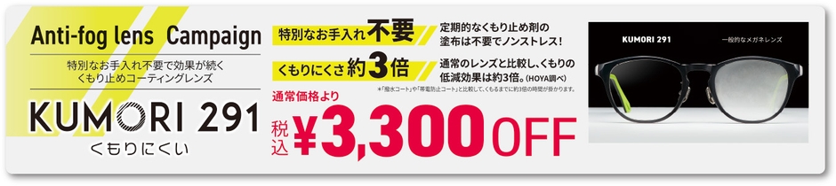 特別なお手入れ不要でノンストレス!通常レンズより約3倍くもりにくいレンズ「KUMORI291」が、期間限定でミキ通常価格より税込\3,300 OFF!(単焦点・遠近両用 2枚1組 税込¥11,000~)