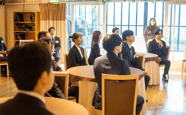 レクリエーション後の懇親会では、内定者同士だけでなく、社員や先輩たちとも笑顔で語り合い、これから共に働く仲間としての絆を築く貴重な時間となりました。会場の至る所で賑やかな会話が繰り広げられ、初対面の緊張も解け、終始和やかな雰囲気に包まれていました。