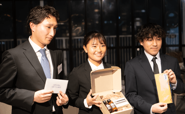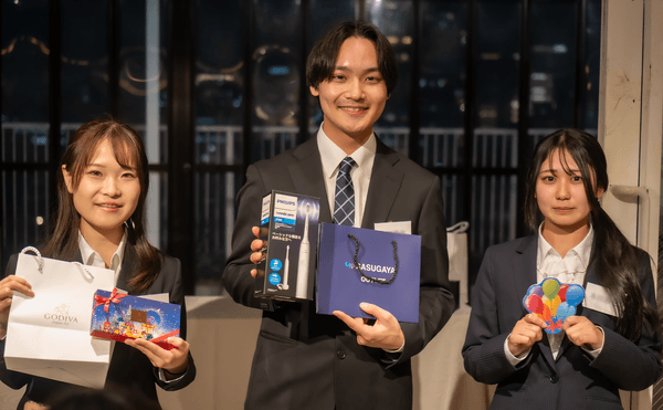 内定者からは工夫を凝らしたユニークな問題が出題され、全員が笑顔で参加できる内容でした。特に注目を集めたのは、豪華景品の数々。PRADAの名刺入れやK18ネックレス、ディズニーのペアチケットといった賞品が用意され、正解を目指して会場全体が一体感に包まれました。